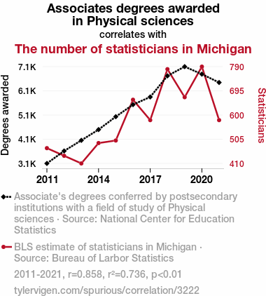 - The spurious research paper: Degrees of Data: Exploring the Statistical Relationship Between Physical Sciences Associates Degrees and Statisticians in Michigan