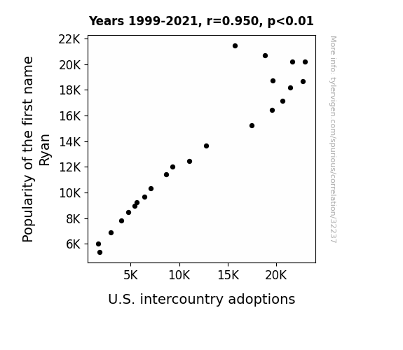 This means 90.2% of the change in the one variable (i.e., U.S. intercountry adoptions) is predictable based on the change in the other (i.e., Popularity of the first name Ryan) over the 23 years from 1999 through 2021.