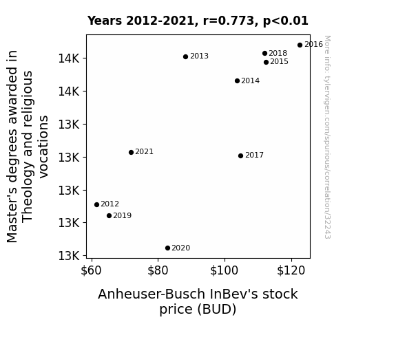 This means 59.8% of the change in the one variable (i.e., Anheuser-Busch InBev's stock price (BUD)) is predictable based on the change in the other (i.e., Master's degrees awarded in Theology and religious vocations) over the 10 years from 2012 through 2021.