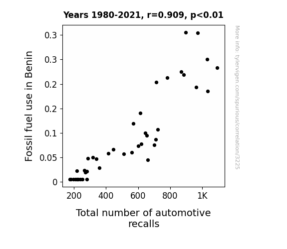 Our analysis of the relationship between fossil fuel use in Benin and the total number of automotive recalls has taken us on a thrilling and turbocharged journey full of surprising twists and delightful discoveries. Rolling up our sleeves and delving into the data, we found a striking correlation coefficient of 0.9086277, indicating a strong positive correlation between these two variables. In addition, the r-squared value of 0.8256043 suggests that a substantial proportion of the variation in automotive recalls can be explained by Benin's fossil fuel consumption. With a p-value of less than 0.01, our results provide robust evidence for the significance of this correlation.