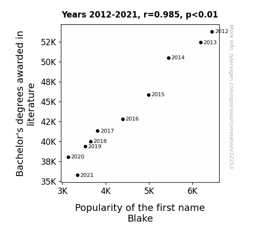 This means 97% of the change in the one variable (i.e., Popularity of the first name Blake) is predictable based on the change in the other (i.e., Bachelor's degrees awarded in literature) over the 10 years from 2012 through 2021.