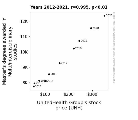 This means 99% of the change in the one variable (i.e., UnitedHealth Group's stock price (UNH)) is predictable based on the change in the other (i.e., Master's degrees awarded in Multi/interdisciplinary studies) over the 10 years from 2012 through 2021.