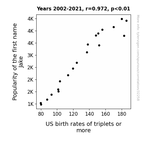 This means 94.6% of the change in the one variable (i.e., US birth rates of triplets or more) is predictable based on the change in the other (i.e., Popularity of the first name Jake) over the 20 years from 2002 through 2021.
