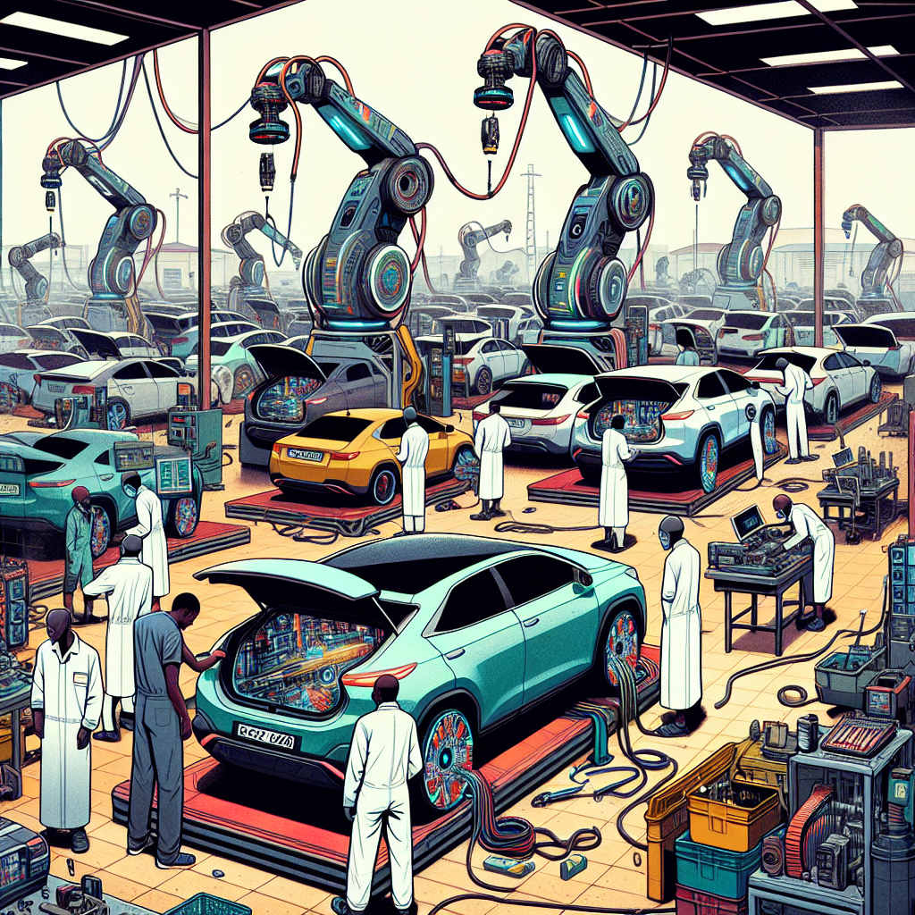 ChatGPT: Generate an image of a futuristic mechanic's workshop in Benin with high-tech tools and robotic arms performing tune-ups and repairs on cars. The workshop should be bustling with activity, showing cars lined up with their hoods open and mechanics wearing high-tech suits. The air is thick with smoke from exhausts, creating a contrast between the advanced technology and the environmental impact of increased fossil fuel use.