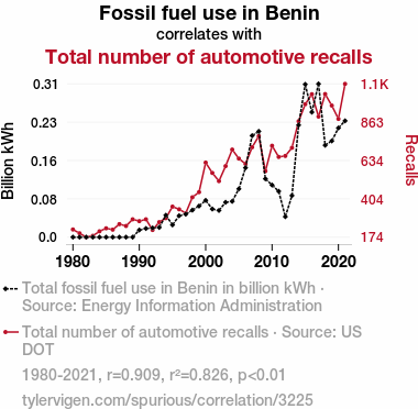 This means 82.6% of the change in the one variable (i.e., Total number of automotive recalls) is predictable based on the change in the other (i.e., Fossil fuel use in Benin) over the 42 years from 1980 through 2021.
