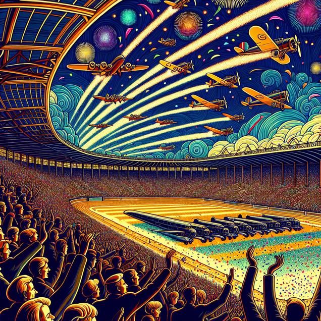 User prompt: Please respond with an image generation prompt that would be likely to create an interesting visual using DALLE-3, using the following style: [ Art nouveau ] and depicting this scene: In a bustling arena, the Golden State Warriors celebrate a victorious season with confetti raining down. Fans cheer and set off fireworks, illuminating the night sky. Meanwhile, a line of planes eagerly await takeoff, fueled up and ready to transport eager fans to Iceland. The surge in demand for jet fuel is evident as planes take off one after another, their engines roaring to life amidst the celebration. Keep the visual depiction simple. Do not include any words or speech bubbles.