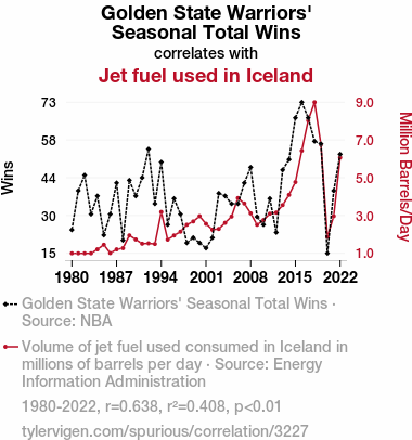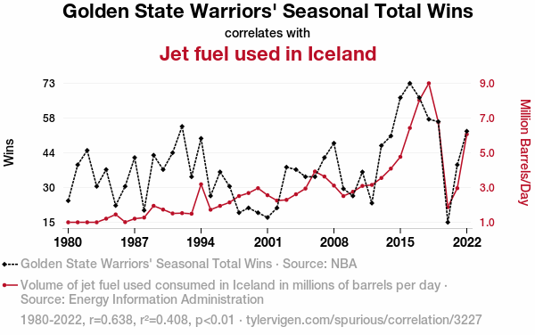 This means 40.8% of the change in the one variable (i.e., Jet fuel used in Iceland) is predictable based on the change in the other (i.e., Golden State Warriors' Seasonal Total Wins) over the 43 years from 1980 through 2022.