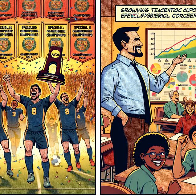 Prompt: Sure, I can craft an image generation prompt to fit your specifications! Here it is: "Generate a comic-book-style illustration with muted colors and a dotted halftone pattern from the 1960s depicting a gymnasium adorned with championship banners. In the foreground, the winning team of the NCAA Soccer Div II Championship Final celebrates their victory by scoring an increasing number of goals. In the background, a nearby classroom shows an increasing number of special education teachers in Maryland, as more students seek academic support. The illustration should reflect the positive correlation between the scenes, symbolizing how goals scored on the field and the demand for special education teachers go hand in hand, as students strive to succeed in their academic pursuits. Keep the visual depiction simple, without any words or speech bubbles." The depiction should include only scenes, people, and objects, it should not include text or speech bubbles.