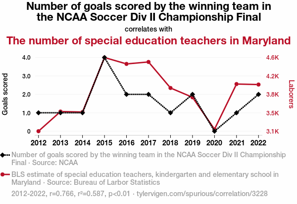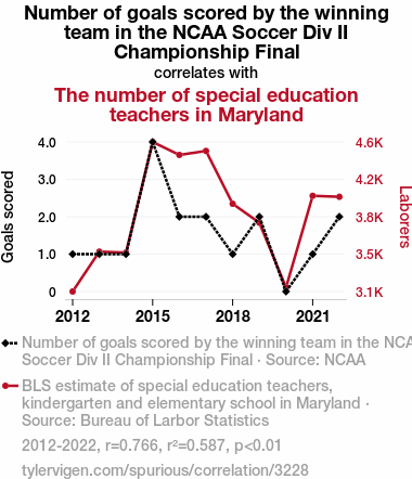 - The spurious research paper: Kicking Goals for Inclusion: A Kickabout of the Correlation between NCAA Soccer Div II Championship Final and the Enrollment of Special Education Teachers in Maryland