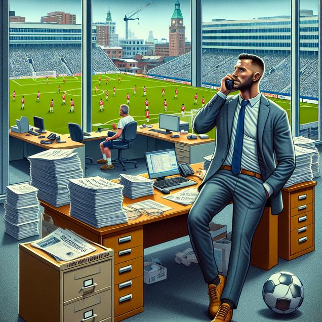 Prompt: Create an image of a TIME magazine cover featuring a scene in a small Maine office where Cristiano Ronaldo is sitting behind a desk stacked with paperwork, dressed in a suit and tie. He is seen talking on the phone with a client about compensation and benefits packages. Meanwhile, in the background, there are multiple empty desks and chairs, symbolizing a shortage of compensation and benefits managers in Maine, as they have all left to pursue soccer careers like Ronaldo. Outside the office, a soccer field in Portugal shows the national team playing a match without Ronaldo, who is absent due to his new job. The visual should capture the contrast between the office setting and the soccer field, showcasing Ronaldo's transition from the soccer pitch to the corporate world. The depiction should include only scenes, people, and objects, it should not include text or speech bubbles.