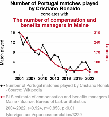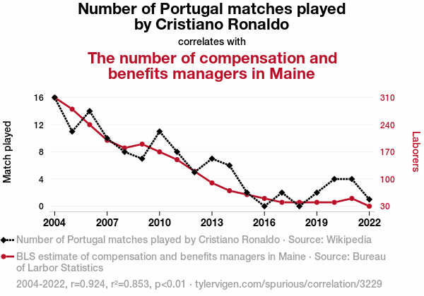 User prompt: Please provide potential search keywords for a paper titled Cristiano Ronaldo's Footwork and Maine's Compensation and Benefits Maneuvers: A Correlational Analysis with an abstract of In this research paper, we delve into the captivating correlation between the number of matches played by the renowned football sensation, Cristiano Ronaldo, for Portugal's national team and the number of compensation and benefits managers in the picturesque state of Maine. Utilizing data gleaned from Wikipedia and the Bureau of Labor Statistics, we employed rigorous statistical methods to uncover the surprising link between these seemingly unrelated variables. Our findings reveal a striking correlation coefficient of 0.9236484 and p < 0.01 for the years spanning 2004 to 2022. Our investigation not only sheds light on this intriguing association but also underscores the importance of approaching research with a dash of humor and curiosity. So, hold on to your boots and buckle up, as we embark on this whimsical yet insightful journey through the world of statistics and sports.