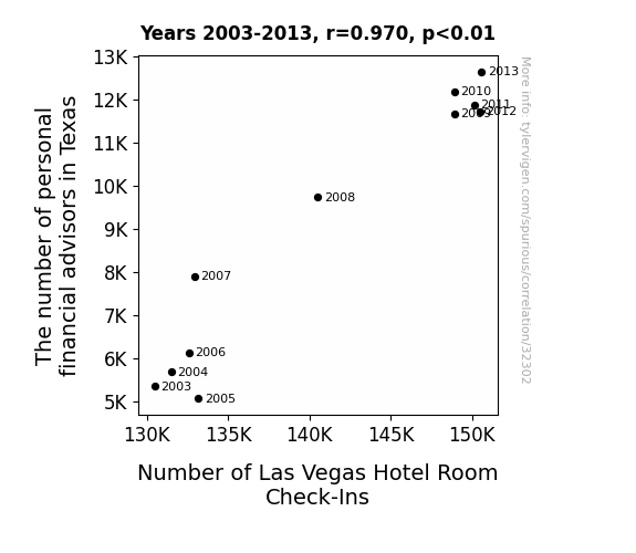 This means 94.1% of the change in the one variable (i.e., Number of Las Vegas Hotel Room Check-Ins) is predictable based on the change in the other (i.e., The number of personal financial advisors in Texas) over the 11 years from 2003 through 2013.