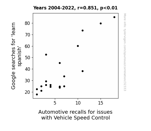 This means 72.3% of the change in the one variable (i.e., Automotive recalls for issues with Vehicle Speed Control) is predictable based on the change in the other (i.e., Google searches for 'learn spanish') over the 19 years from 2004 through 2022.