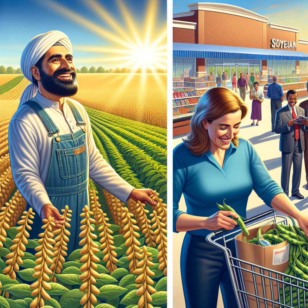 Prompt: "Generate an image inspired by a Discovery magazine cover, depicting a sun-drenched soybean field in Michigan. The farmer smiles as he surveys genetically modified soybean plants reaching toward the clear blue sky. Next to the field, a bustling Costco store hums with activity as satisfied customers fill their carts with affordable soy products. The scene is filled with the contented murmurs and smiles of shoppers as they effortlessly stick to their grocery budget and find their favorite soy-based products, feeling happy and fulfilled." The depiction should include only scenes, people, and objects, it should not include text or speech bubbles.