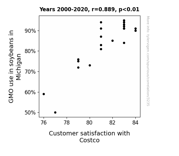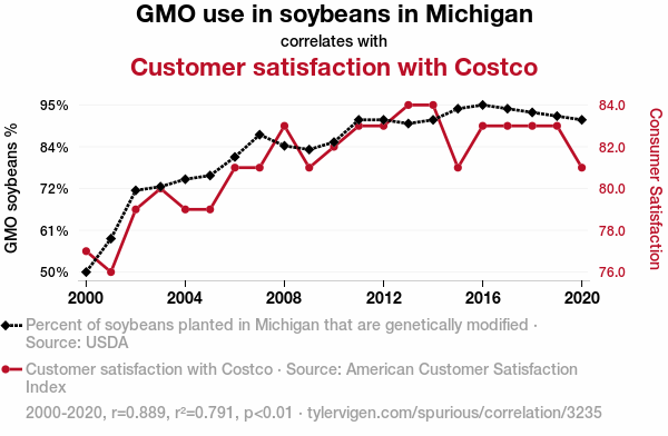 This means 79.1% of the change in the one variable (i.e., Customer satisfaction with Costco) is predictable based on the change in the other (i.e., GMO use in soybeans in Michigan) over the 21 years from 2000 through 2020.