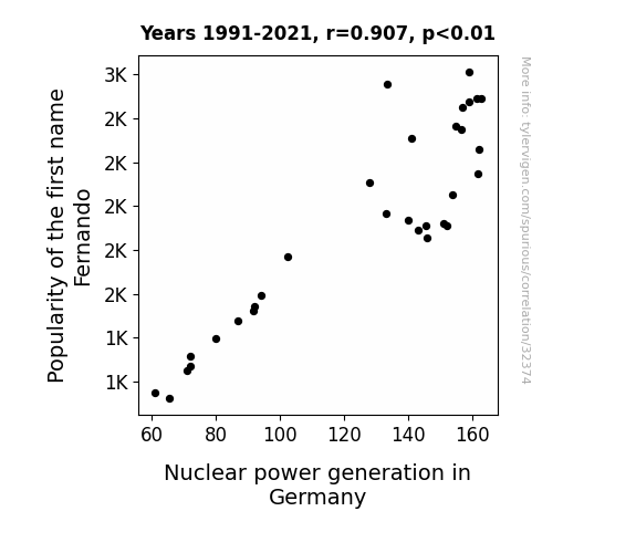 This means 82.3% of the change in the one variable (i.e., Nuclear power generation in Germany) is predictable based on the change in the other (i.e., Popularity of the first name Fernando) over the 31 years from 1991 through 2021.