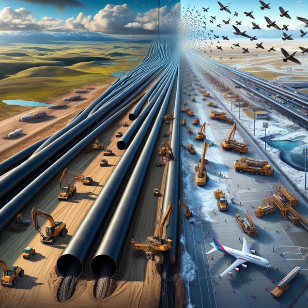 Prompt: Certainly! Here's an image generation prompt for DALL·E-3: [ Hyper-realistic ] In North Dakota, a growing fleet of massive pipelayers spans the open landscape, with thick black pipelines snaking through the earth. Meanwhile, in Indonesia, a bustling airport experiences a remarkable surge in jets refueling, as a stream of migratory turtles soar overhead, their flight path perfectly aligned with the newly-laid pipelines, creating an unexpected surge in jet fuel demand. I hope this prompt leads to an intriguing and visually stunning image! The depiction should include only scenes, people, and objects, it should not include text or speech bubbles.