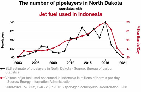 pipelayers, jet fuel, underground connections, North Dakota, Indonesia, correlation coefficient, p-value, Bureau of Labor Statistics, Energy Information Administration, fuel consumption, pipeline construction, jet fuel usage