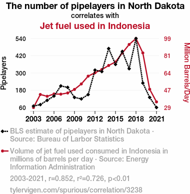 To untangle the knotty relationship between the number of pipelayers in North Dakota and the consumption of jet fuel in Indonesia, our research team delved into a veritable treasure trove of data. We scoured the digital landscape with a fervor rivaled only by a squirrel in an acorn emporium, collecting information from the Bureau of Labor Statistics and the Energy Information Administration spanning the years 2003 to 2021.