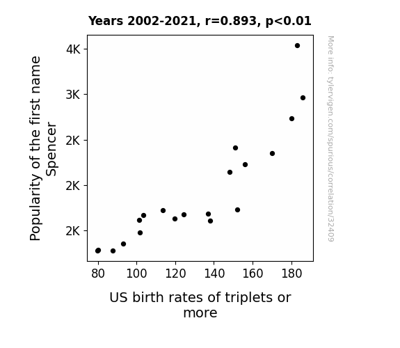 This means 79.8% of the change in the one variable (i.e., US birth rates of triplets or more) is predictable based on the change in the other (i.e., Popularity of the first name Spencer) over the 20 years from 2002 through 2021.