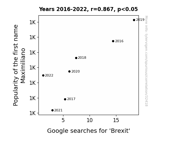 This means 75.2% of the change in the one variable (i.e., Google searches for 'Brexit') is predictable based on the change in the other (i.e., Popularity of the first name Maximiliano) over the 7 years from 2016 through 2022.