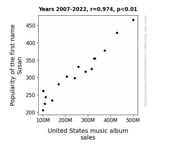 This means 94.9% of the change in the one variable (i.e., United States music album sales) is predictable based on the change in the other (i.e., Popularity of the first name Susan) over the 16 years from 2007 through 2022.