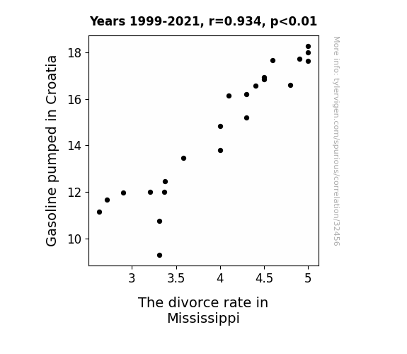 This means 87.3% of the change in the one variable (i.e., The divorce rate in Mississippi) is predictable based on the change in the other (i.e., Gasoline pumped in Croatia) over the 23 years from 1999 through 2021.