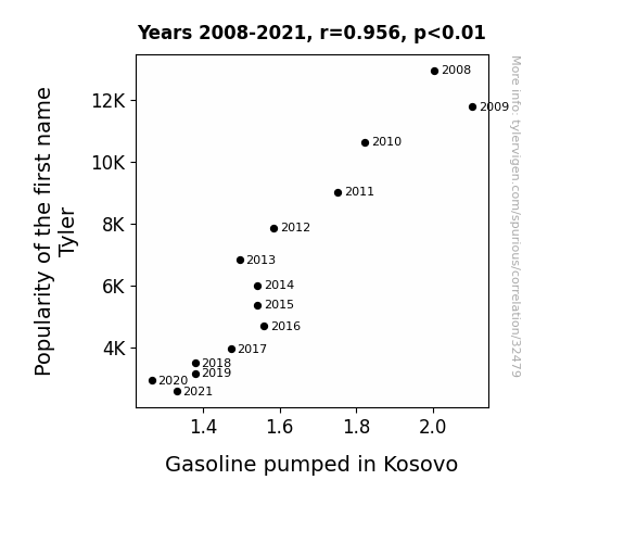 This means 91.4% of the change in the one variable (i.e., Gasoline pumped in Kosovo) is predictable based on the change in the other (i.e., Popularity of the first name Tyler) over the 14 years from 2008 through 2021.