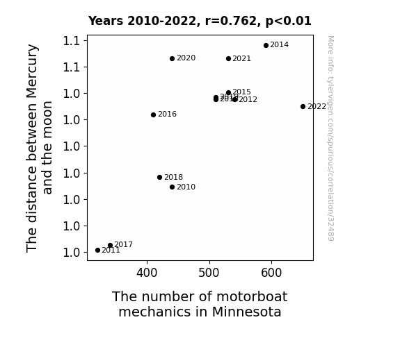 This means 58% of the change in the one variable (i.e., The number of motorboat mechanics in Minnesota) is predictable based on the change in the other (i.e., The distance between Mercury and the moon) over the 13 years from 2010 through 2022.