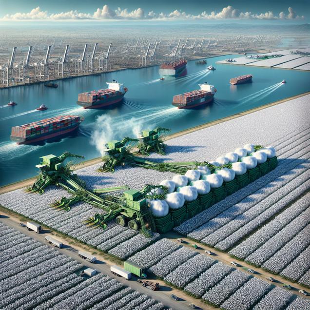 User prompt: Please describe a visual scene that prominently depicts both GMO use in cotton in California and Fossil fuel use in Bermuda, in the following situation: Because the genetically modified cotton in California led to an increase in cotton production, the demand for cotton harvesting machinery skyrocketed. This caused manufacturers to ramp up production, leading to an increase in fossil fuel use for transportation and manufacturing. Additionally, the improved resistance of GMO cotton to pests meant that less pesticide was needed, resulting in a surplus that was exported to Bermuda, further contributing to fossil fuel use through international shipping.. Keep the description simple.