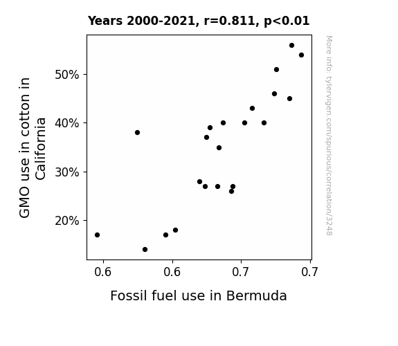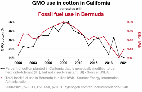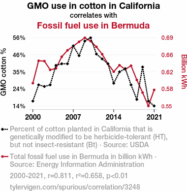 This means 65.8% of the change in the one variable (i.e., Fossil fuel use in Bermuda) is predictable based on the change in the other (i.e., GMO use in cotton in California) over the 22 years from 2000 through 2021.