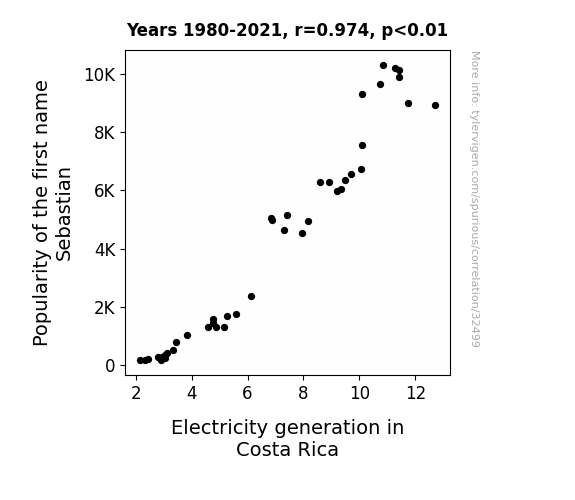 This means 94.8% of the change in the one variable (i.e., Electricity generation in Costa Rica) is predictable based on the change in the other (i.e., Popularity of the first name Sebastian) over the 42 years from 1980 through 2021.