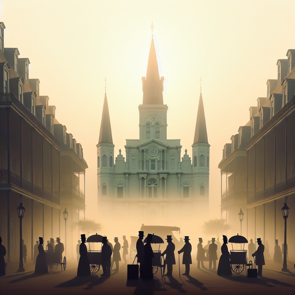 User prompt: Please respond with an image generation prompt that would be likely to create an interesting visual using DALLE-3, using the following style: [ A Discovery magazine cover image ] and depicting this scene: In downtown Lafayette, Louisiana, a thick layer of smog had obscured the view of the historic buildings for years. As the air pollution decreased, the lingering haze gradually lifted, revealing a group of formerly invisible bellhops standing on the sidewalks with their now visible cloaks. With the reduced pollution, people were now able to see the bellhops and their services were no longer in demand as they once were. Keep the visual depiction simple. Do not include any words or speech bubbles.
