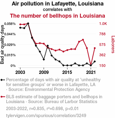 User prompt: Please provide potential search keywords for a paper titled Lafayette's Lousy Pollution and Louisiana's Lively Bellhop Bureau: A Correlative Analysis with an abstract of This paper investigates the peculiar relationship between air pollution in Lafayette, Louisiana, and the number of bellhops in the whole state, which we humorously dub as "The Breathtaking Bellhop Correlation." Our research team meticulously combed through data from the Environmental Protection Agency and the Bureau of Labor Statistics to tackle this seemingly preposterous query. To our surprise, we discovered a captivating correlation coefficient of 0.8352544 and a p-value less than 0.01 for the period spanning from 2003 to 2022. We delve into the intriguing possibility that the influx of atmospheric pollutants in Lafayette might be positively influencing the demand for bellhops throughout Louisiana. Our findings may sound like a joke, but we assure you, the statistical connections are no flight of fancy.