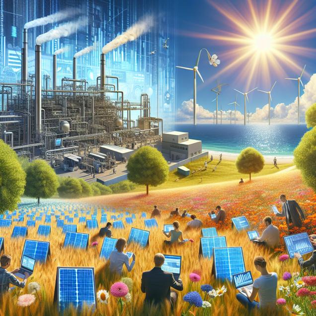 Prompt: Prompt: Generate an image using the style of [ High-tech ] that shows a bright, sunny field in Maine. In the field, a group of statisticians are working amongst tall grass and wildflowers, their laptops and calculators at the ready. In the distance, a modern factory is churning out an increasing number of sleek, high-tech pocket protectors. As the statisticians work, the factory's production grows. In the U.S. Virgin Islands, mini solar panels are being installed, glistening in the sun, powered by the surplus energy produced in Maine. The panels stand out against the backdrop of the bright blue ocean, symbolizing the growth of renewable energy thanks to the efforts of the statisticians. The depiction should include only scenes, people, and objects, it should not include text or speech bubbles.