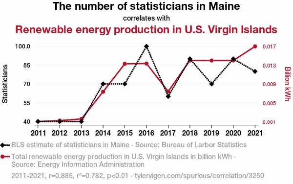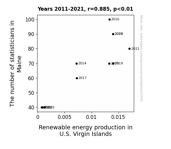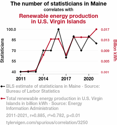 This means 78.2% of the change in the one variable (i.e., Renewable energy production in U.S. Virgin Islands) is predictable based on the change in the other (i.e., The number of statisticians in Maine) over the 11 years from 2011 through 2021.
