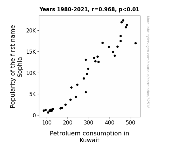 This means 93.7% of the change in the one variable (i.e., Petroluem consumption in Kuwait) is predictable based on the change in the other (i.e., Popularity of the first name Sophia) over the 42 years from 1980 through 2021.