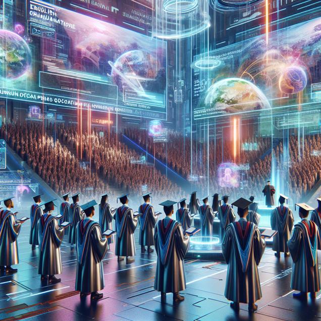 ChatGPT: [ Cybernetic art ] Generate an image of a futuristic university graduation ceremony where students are receiving their Bachelor's degrees in English language and literature. The backdrop is a dazzling, technologically advanced stage with holographic projections. The students wear sleek, metallic robes and futuristic academic regalia. As they celebrate, a holographic news headline flashes on a nearby screen, depicting a graph showing a decline in the number of probation officers in Hawaii. The scene reflects the correlation between the decrease in English literature graduates and its impact on the demand for probation officers in the state. The atmosphere is electrifying with vibrant neon lights and futuristic elements.