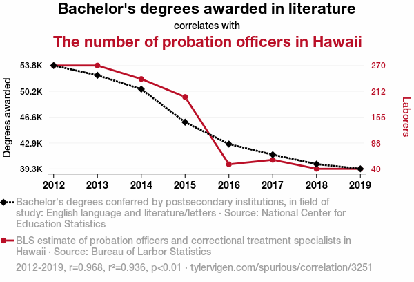 This means 93.6% of the change in the one variable (i.e., The number of probation officers in Hawaii) is predictable based on the change in the other (i.e., Bachelor's degrees awarded in literature) over the 8 years from 2012 through 2019.