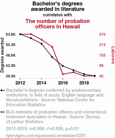 User prompt: Please make up a funny explanation for how a decrease in Bachelor's degrees awarded in English language and literature/letters caused The number of probation officers in Hawaii to decrease.