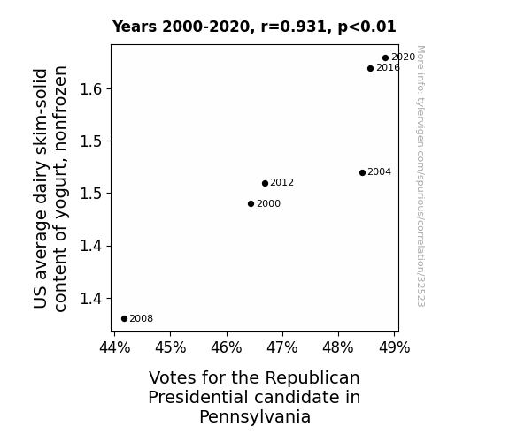 This means 86.7% of the change in the one variable (i.e., Votes for the Republican Presidential candidate in Pennsylvania) is predictable based on the change in the other (i.e., US average dairy skim-solid content of yogurt, nonfrozen) over the 6 years from 2000 through 2020.