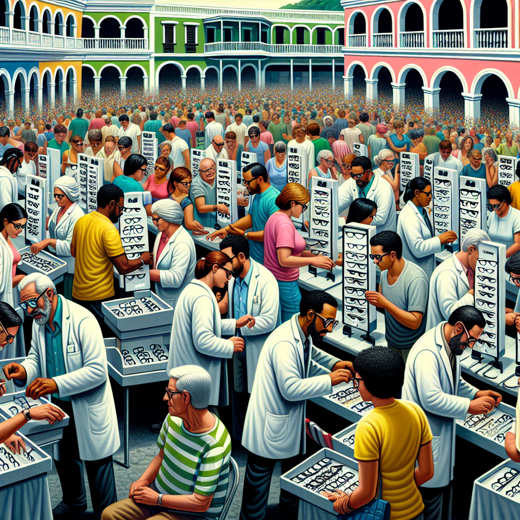 User prompt: Please respond with an image generation prompt that would be likely to create an interesting visual using DALLE-3, using the following style: [ Scalar art ] and depicting this scene: In a crowded town square in Puerto Rico, opticians set up small booths to tend to the bustling crowd. A line of people forms outside the local post office where the cost to send a letter via USPS has just increased. As curious onlookers watch, the opticians are seen discreetly slipping weightless eyeglass prescriptions into the mail slots, causing the postal service to raise prices to cover the invisible but very real burden. Keep the visual depiction simple. Do not include any words or speech bubbles.