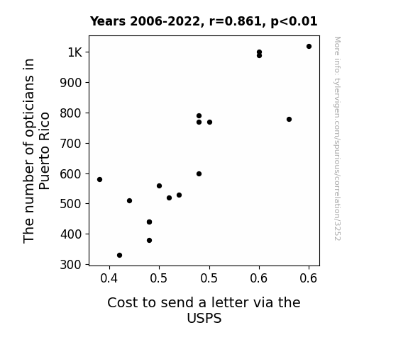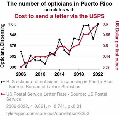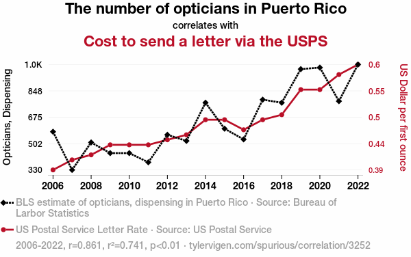This means 74.1% of the change in the one variable (i.e., Cost to send a letter via the USPS) is predictable based on the change in the other (i.e., The number of opticians in Puerto Rico) over the 17 years from 2006 through 2022.