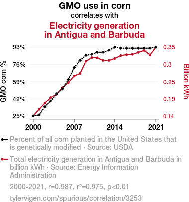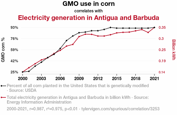 This means 97.5% of the change in the one variable (i.e., Electricity generation in Antigua and Barbuda) is predictable based on the change in the other (i.e., GMO use in corn) over the 22 years from 2000 through 2021.