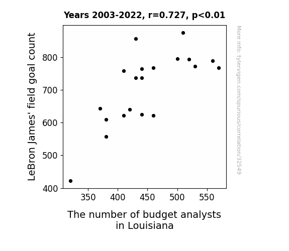 This means 52.8% of the change in the one variable (i.e., The number of budget analysts in Louisiana) is predictable based on the change in the other (i.e., LeBron James' field goal count) over the 20 years from 2003 through 2022.