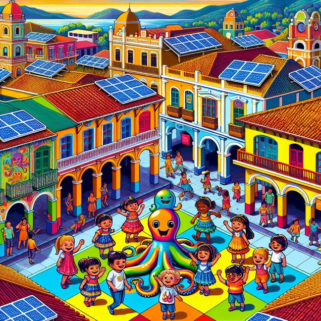 ChatGPT: [ Cutsy art illustration ] Generate an image of a vibrant Nicaraguan cityscape, replete with colorful buildings and bustling streets. In the foreground, depict a group of joyful children with the name Octavia, each wearing adorable octopus-themed costumes and playing amidst a playground adorned with similar motifs. Above and around the city, visualise sparkling octopus-shaped solar panels adorning the rooftops, capturing the abundant sunlight and providing a sense of clean, renewable energy. Show the children's excitement and the city's embracing of solar power, illustrating the wave of fascination and delight that the Octavias have inspired with their influential celebration.