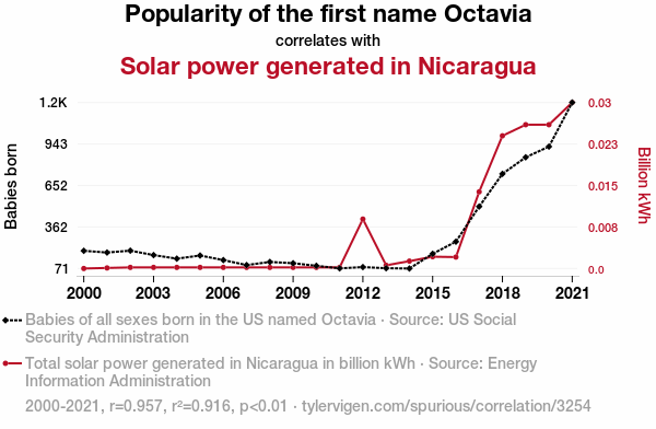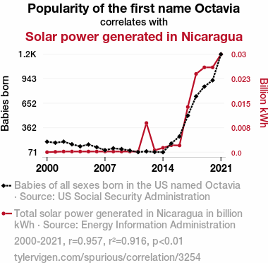 This means 91.6% of the change in the one variable (i.e., Solar power generated in Nicaragua) is predictable based on the change in the other (i.e., Popularity of the first name Octavia) over the 22 years from 2000 through 2021.