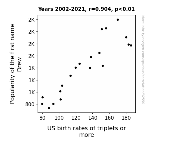 This means 81.8% of the change in the one variable (i.e., US birth rates of triplets or more) is predictable based on the change in the other (i.e., Popularity of the first name Drew) over the 20 years from 2002 through 2021.