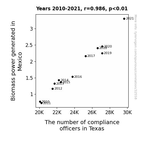 This means 97.2% of the change in the one variable (i.e., The number of compliance officers in Texas) is predictable based on the change in the other (i.e., Biomass power generated in Mexico) over the 12 years from 2010 through 2021.