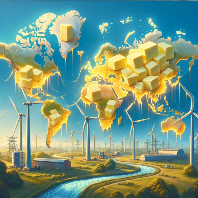 Prompt: [A photo-realistic image] Generate an image of a sprawling world map, with countries rendered in exquisite detail and soft lighting to give it a natural, earthy feel. On this map, depict large chunks of butter placed in countries with high consumption, almost like golden droplets adorning the landscape. The butter should have a luxurious, glossy sheen and look creamy and inviting. Beside the map, envision a scenic countryside with a group of majestic wind turbines towering over the land. The turbines are elegant and sleek, their blades catching the light and casting gentle shadows on the ground. These turbines are all connected by a complex network of wires and grids leading to a central power station, which hums with energy and purpose. From the turbines, visualize a swirling wind trail that gracefully winds its way back to the map, where thick, translucent arrows indicate the flow of wind power from the turbines to the areas with high butter consumption. The arrows should be dynamic and vivid, emphasizing the connection between the two variables. This composition should visually represent the fusion of butter consumption and wind power generation, blending two seemingly disparate elements into a harmonious visual narrative that highlights the relationship between them. The depiction should include only scenes, people, and objects, it should not include text or speech bubbles.
